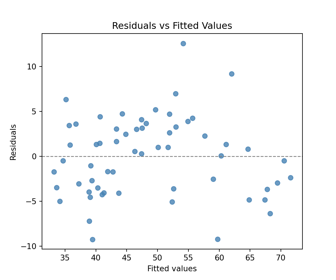 In this section, we consider the construction of model diagnostic graphs discussed in the lecture slides. The first graph compares the fitted values (i.e the predictions) with the residuals of the model. The fitted values and the residuals of the model can be computed as follows: