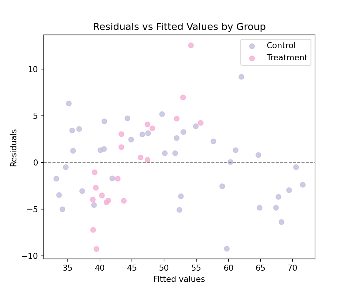 plt.title("Residuals vs Fitted Values by Group")