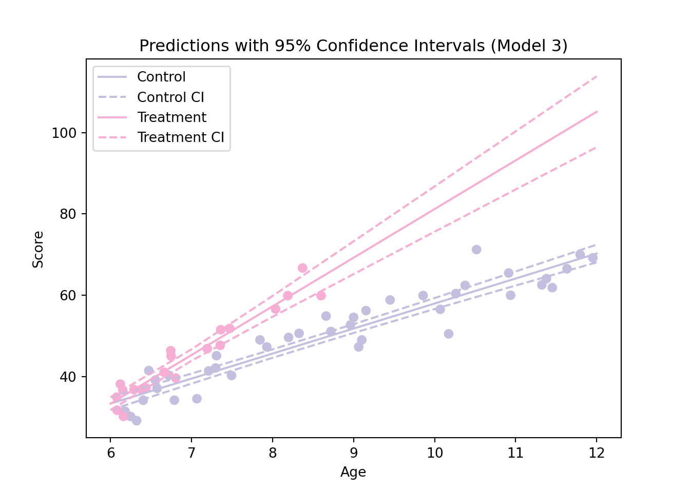 which corresponds to the expected (or average) score for a child of a certain age in a certain group. But how certain are we about this expected score? To answer this question, we can compute confidence intervals (typically at the 95% confidence level) for our predicted scores. This can be done very similarly to what we did before using the method get_prediction().summary_frame(). First, we recall how the third model is estimated:
