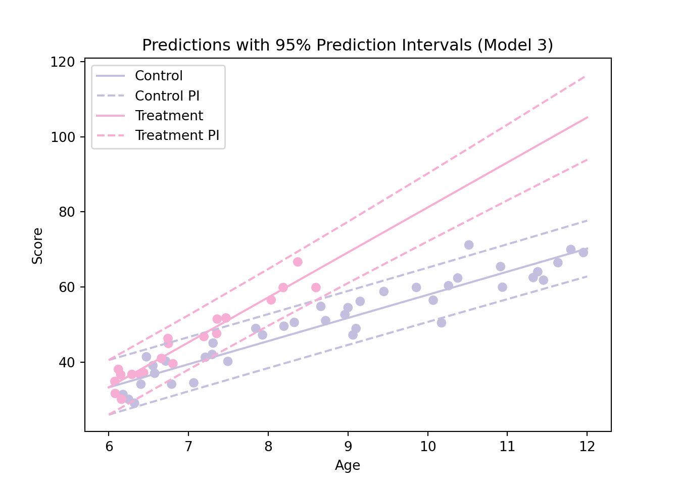 In this output, we can see that our prediction intervals are much wider than the previous confidence intervals. For example, for a child of age 7 our predicted score is 39.50267 but the corresponding 95% prediction interval is (32.30440 46.70093). This means that with a probability of 95%, we expect the score of a child of age 7 in the control group to be somewhere between 32.30440 and 46.70093.